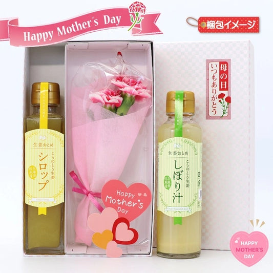 送料無料「母の日早割」こうのとり生姜シロップorしぼり汁&生花プチカーネーションの花束セット