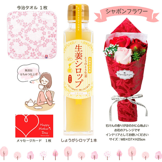 母の日ギフト2026無添加生姜シロップ+今治のさくらハンカチ+シャボンフラワーレッド