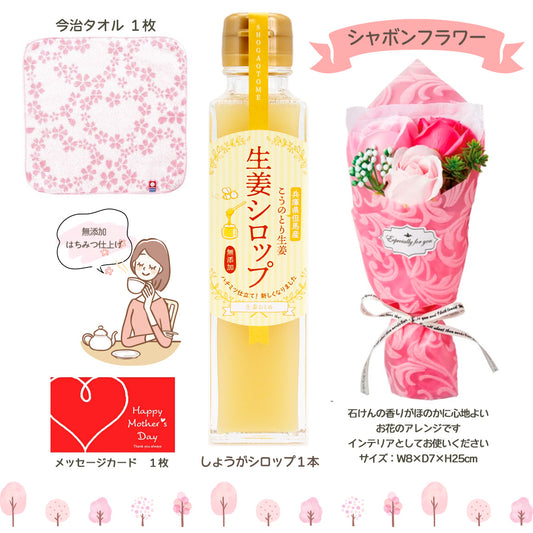 母の日ギフト2026無添加生姜シロップ+今治のさくらハンカチ+シャボンフラワーピンク